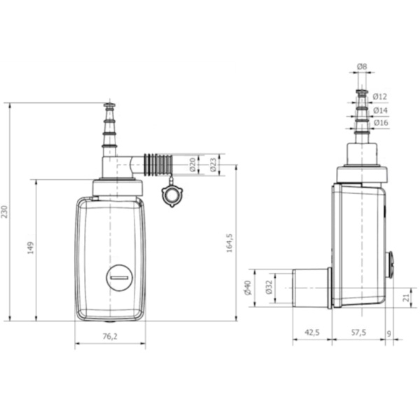 Sifon de condens cu montaj incastrat, fabricat din PP, utilizat pentru sisteme de aer conditionat, pompe de caldura si alte echipamente care produc condens. Are rolul de a obtura mirosurile neplacute. Racordul de intrare are diametrul exterior in trepte de la 8 la 20 mm si se conecteaza la tuburi, tevi cu diametre de 32 sau 40 mm.