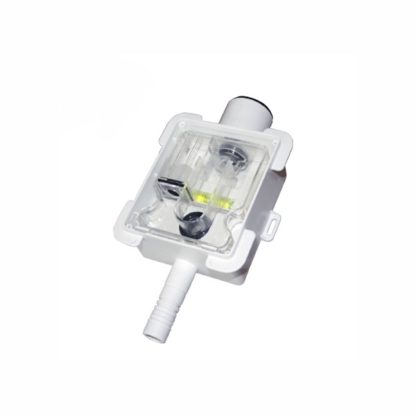 Sifon pentru condens cu montaj incastrat, fabricat din plastic transparent, utilizat pentru sisteme de aer conditionat, pompe de caldura si alte echipamente care produc condens pentru a obtura mirosurile neplacute. Racordul de intrare are diametrul exterior in trepte, de la 16 la 40 mm iar iesirea se conecteaza la tuburi, tevi cu diametre de la 18 la 20 mm.