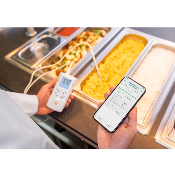 Setul Testo 110 este configuratia gata de utilizare pentru masurarea temperaturii in domeniul alimentar. Pachetul include instrumentul Testo 110, husa de protectie TopSafe si o sonda alimentara NTC din otel inox pentru verificari in receptie, productie, depozitare si transport. Conectarea la aplicatia testo Smart App simplifica setarile, alarmele si generarea rapoartelor PDF.